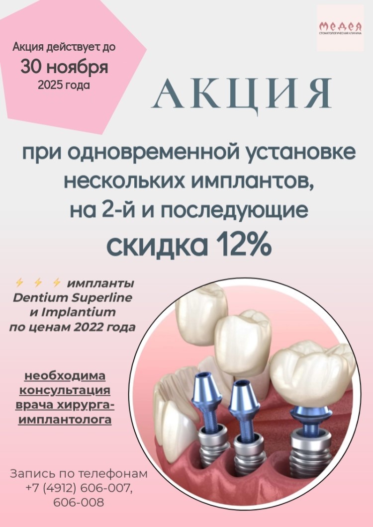 АКЦИЯ на одновременную установку нескольких имплантов: на второй и каждый последующий — скидка 12%. Необходима консультация врача – хирурга-имплантолога. Акция действует до 30 ноября 2025 г.
